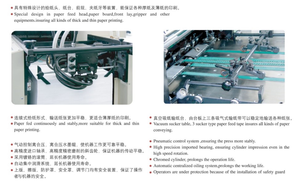 ເມື່ອມັນມາກັບ A2 Four-Color Short-runting Offset Printing Press, ມັນຖືກສ້າງຂຶ້ນດ້ວຍໂມດູນທີ່ມີປະສິດທິພາບສູງທີ່ເຮັດໃຫ້ມັນຫນ້າເຊື່ອຖື - ເຫມາະສໍາລັບວຽກງານການພິມໄລຍະສັ້ນ. ໂມດູນເຫຼົ່ານີ້ປະກອບມີມ້ວນແລະເກຍທີ່ມີຄວາມແມ່ນຍໍາສູງ, ກົນໄກການໃຫ້ອາຫານເຈ້ຍທີ່ເຂັ້ມແຂງ, ລະບົບການລົງທະບຽນເຈ້ຍທີ່ຊັດເຈນ, ແລະລະບົບການສະຫນອງຫມຶກທີ່ຫມັ້ນຄົງ. ມັນຕອບສະຫນອງຄວາມຕ້ອງການຂອງຕະຫຼາດສໍາລັບການພິມສີແຜ່ນຕັດທີ່ມີຄຸນະພາບສູງ, ມີປະສິດທິພາບ, ແລະປະຫຍັດຄ່າໃຊ້ຈ່າຍ, ໂດຍສະເພາະສໍາລັບວຽກໄລຍະສັ້ນ. ມັນ​ສາ​ມາດ​ຈັດ​ການ​ຂະ​ຫນາດ​ໃຫຍ່​ຂອງ​ຄວາມ​ຫນາ​ຂອງ​ເຈ້ຍ — ຈາກ 0.04mm ເຈ້ຍ​ບາງ​ເຖິງ 0.4mm cardboard ຫນາ​. ແລະມີການຄວບຄຸມຫນ້າຈໍສໍາຜັດແລະການໂຕ້ຕອບການຂຽນໂປຼແກຼມ intuitive, ທ່ານສາມາດປັບຕົວແບບສະຫມາດກັບການຕັ້ງຄ່າທັງຫມົດແລະຕົວກໍານົດການພິມໄດ້ຢ່າງງ່າຍດາຍ.